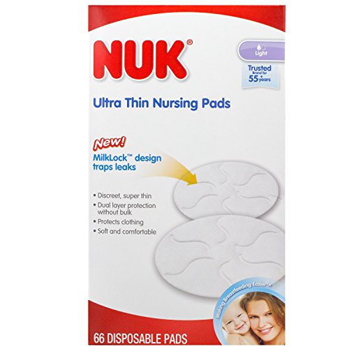 -. Binding : Baby Product -. Brand : NUK -. Feature : Thinner than leading nursing pads / MilkLock design traps leaks with extra soft, breathable material / Dual layer construction provides protection without bulk for a discrete look / Protective back layer helps prevent leak-through stains / Recommended for light flow or established milk production only -. Label : NUK -. Manufacturer : NUK -. ProductGroup : Baby Product -. ProductTypeName : BABY_PRODUCT -. Publisher : NUK -. Studio : NUK -. Title : NUK Ultra Thin Disposable Nursing Pads, 66 Count