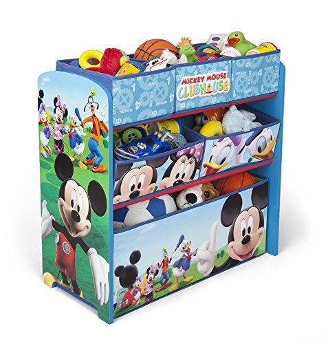 Delta Children's Products Mickey Mouse Multi Bin Organizer The wonderful Mickey Mouse Multi-Bin Toy Organizer is the perfect gift to help your little one keep their things in order. Featuring all of his favorite Mickey Mouse characters, this useful organizer includes three small sized fabric storage bins at the top, two medium sized fabric storage bins in the middle, and one large fabric storage bin at the bottom. These storage bins are supported by well-constructed wood designed with Mickey and all his friends to help make cleaning up constructive and entertaining.Feature