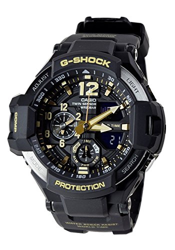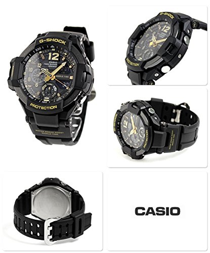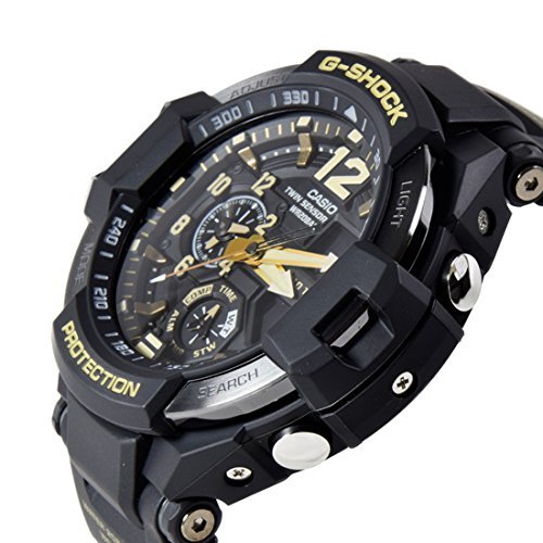 -. Feature : ・ 方位、温度が計測可能なツインセンサー ・ 高輝度なLEDライト「スーパーイルミネーター」 / ・ 2都市の時刻を同時表示できるデュアルダイアルワールドタイム ・ 針退避機能 / 陸・海・空、それぞれの極限の状況下での使用を想定し、特殊機能を備えたマスターオブG(MASTER OF G)シリーズから、「ヴィンテージ」をテーマにした「Vintage Black & Gold(ヴィンテージブラック&ゴールド)」モデルが登場。 G-SHOCKのブランドカラーであるブラックをベースカラーに、時字、時分針にゴールドやベージュを採用。過酷な任務に当たるパイロットなどが愛用し、使い込んだツールや機材の風合いをイメージし、長い時を経て刻み込まれた深い味わいを表現しました。色褪せた計器盤をモチーフに、グラビティマスターに相応しいこだわりの配色を細部に至るまで施しました。 長期間のハードな使用にも耐える「タフ」なG-SHOCKを、時の流れをまとわせたカラーで表現したNewモデルの登場です。