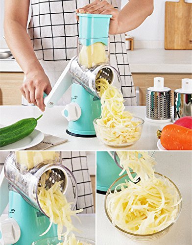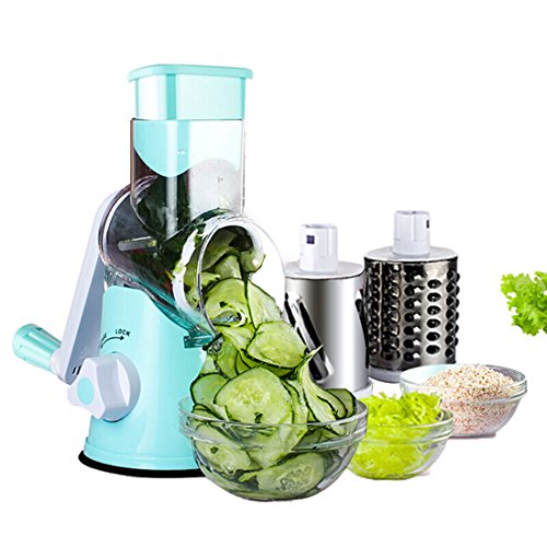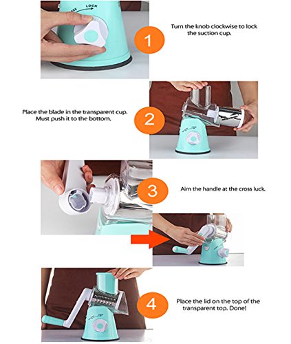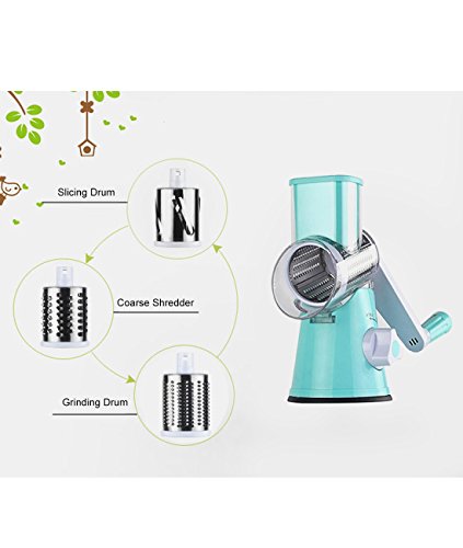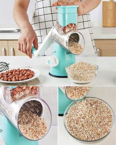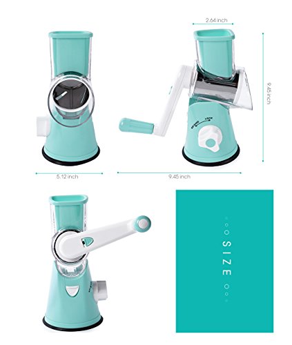 EASY TO USE:Simple hand crank turns interchangeable drum and creates perfectly grated ingredients.Easy to operate and clean. •SUPER EFFICIENT:Roller design, shake 1 circle equals to cut 12 times on board.More efficiency to save time and effort