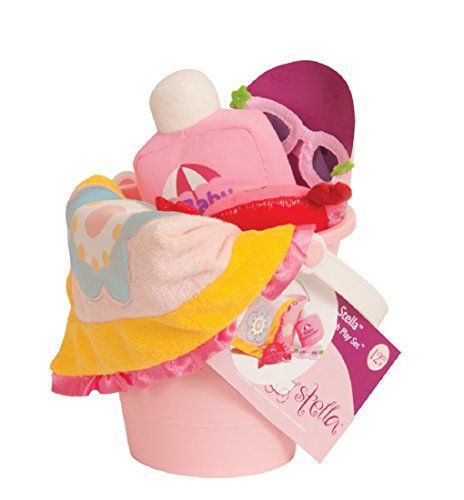 The Baby Stella Day at the Beach Playset includes a bucket full of beach time essentials! Beach set includes a plastic bucket, terry cloth towel, sunglasses with Velcro-like closure, sunscreen, and a little toy crab companion.