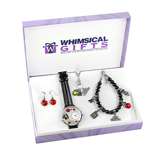 -. Feature : watch includes scratch resistant glass; water resistant case; leather strap, quartz movement / bracelet includes glass beads; pewter hand painted charms; sterling silver/gold plated chain / earrings include french style; rubber back; pewter hand-painted charms / necklace includes rolo chain; hand-painted pewter charms; lobster claw / designed, assembled, hand-crafted in USA
