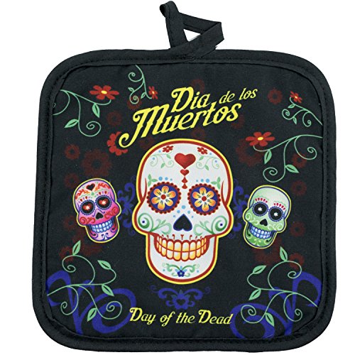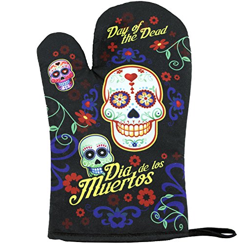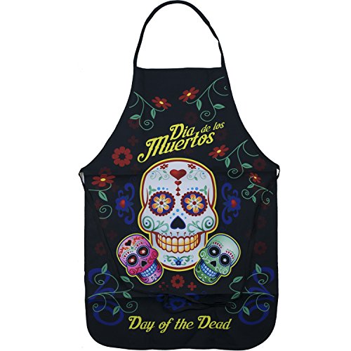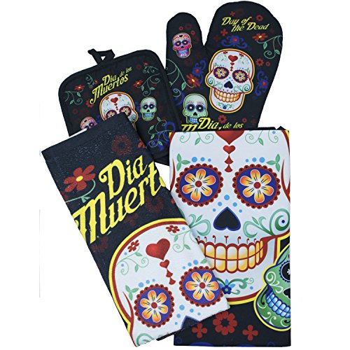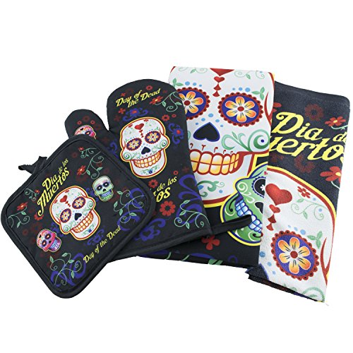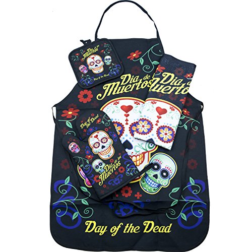 Day of the Dead Sugar Skull Kitchen Apron Set - Created for Baking, Grilling, Chefs, Cooks, For Home or Gift - 4 Pieces (1) Unisex Fits Most Apron (1) Kitchen / Tea Towel (1) Pot Holder (1) Oven Mitt
