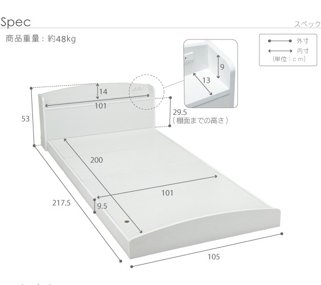 サイズ:ベッド-幅105x奥行217.5x高さ53cm・約48kg、マットレス-幅97x奥行195x高さ17cm・約18kg
