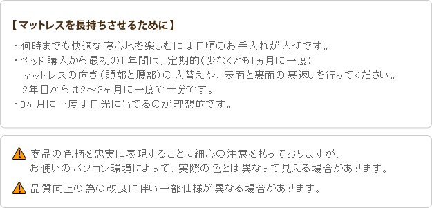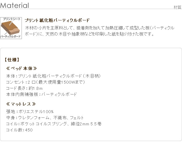 材質:ベッド本体-プリント紙化粧パーティクルボード(木目柄)、ベッド本体内側補強板-パーティクルボード、ベッドコンセント-2口合計1500W・コード長1.8m、マットレス張地-ポリエステル100%、マットレス中身-ウレタンフォーム・不織布・フェルト、マットレスコイル-ポケットコイルスプリング・コイル数450