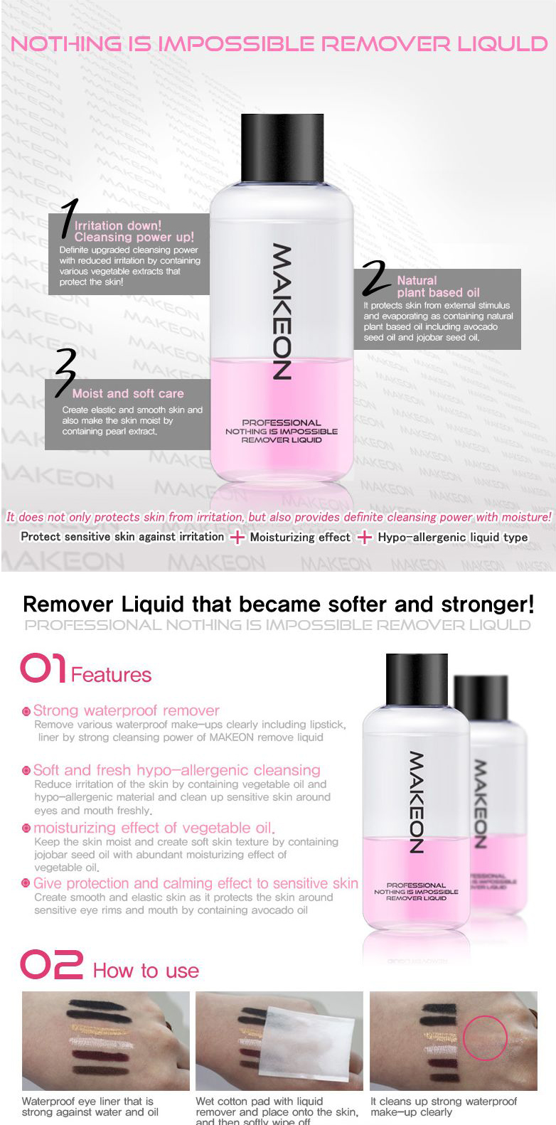 Not only protect the skin from stimulus but also provide definite removal effect with moisturizing Strong waterproof remover Soft and fresh hypoallergenic cleansing Moisturizing effect of vegetable oil Give protection and calming effect to sensitive skin