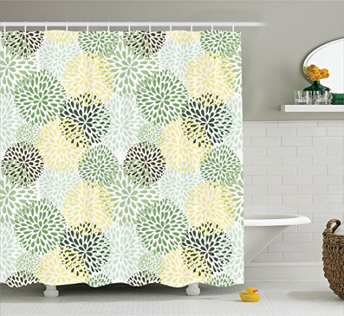 Ambesonne House Decor Collection, Modern Floral Ornate Petals Flourish Traditional Springtime Garden Leaves Image Pattern, Polyester Fabric Bathroom Shower Curtain Set with Hooks, Soft Green Cream