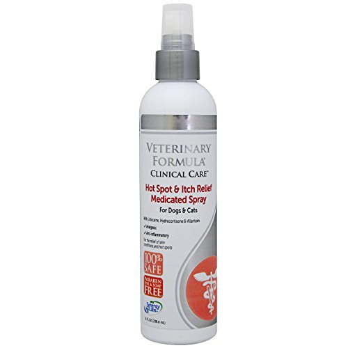 Veterinary Formula Clinical Care Hot Spot & Itch Relief Medicated Spray for Dogs and Cats contains Lidocaine, Hydrocortisone & Aloe Vera. Analgesic and anti-inflammatory spray. Paraben, Dye, and Soap free. Provides rapid relief of inflammation, Pruritus (itchy skin) and associated conditions. Lidocaine: relieves itching, burning and pain from skin inflammations. Hydrocortisone: reduces the cause of inflammation, redness and swelling. Allantoin: helps stimulate healing of wounds. Glycerin: treats dry, rough, scaly, itchy skin and minor skin irritations. Wheat Germ Oil: humectant and antioxidant properties moisturize skin.