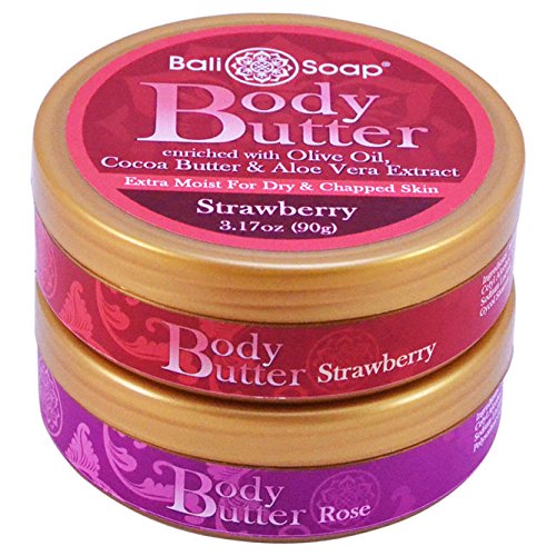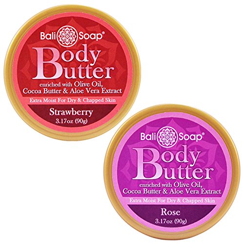-. Binding : Misc. -. Brand : Bali Soap -. EAN : 8997003024121 -. Feature : Exotic body butter from the Island of Bali / Rich, thick and creamy / Keeps your skin hydrated in dry environments / Cocoa butter and olive oil for extra skin nourishment / Robustly scented -. IsAdultProduct : 0 -. Label : Bali Soap USA -. Manufacturer : Bali Soap USA -. MPN : 5289715 -. NumberOfItems : 2 -. PackageQuantity : 2 -. PartNumber : 5289715 -. ProductGroup : Beauty -. ProductTypeName : BEAUTY -. Publisher : Bali Soap USA -. Size : 3.1 Ounces -. Studio : Bali Soap USA -. Title : Bali Soap - Body Butter, 2 pc Set, 3.1 Oz each (Strawberry & Rose)