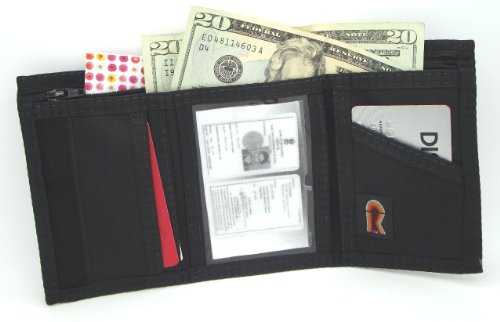 TRIFOLD Velcro WALLET with INSIDE ID. BLACK Size: 5" High X 3 1/4" Wide. One clear ID window on the inside. Inside A zippered pouch runs the entire length of the wallet behind Billfold Pocket . Photo Insert Included. Hook and Loop Closure / Water Resistant and Washable / Made in U.S.A.