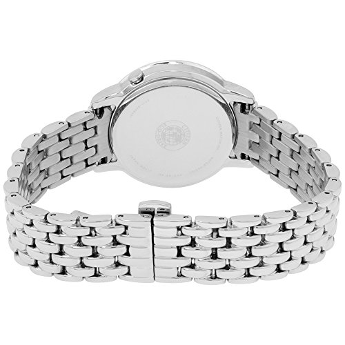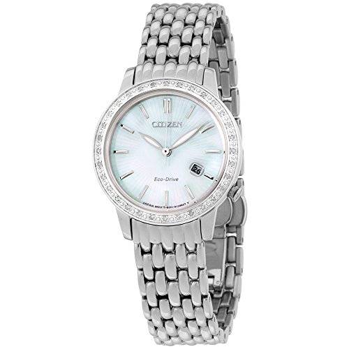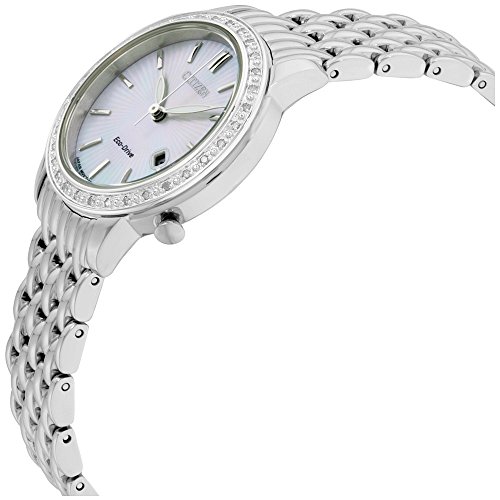 Citizen Eco-Drive Diamond MOP Dial Stainless Steel Ladies Watch EW2280-58D. 30 mm silver tone stainless steel case with a diamond-studded bezel, a mother of pearl dial, a mineral crystal, and silver tone luminescent hands and index hour markers. Date window at the 4 o'clock position. Logo beneath the 12 o'clock position. Hands: hours, minutes, and seconds. Case thickness of 7 mm. Push / pull crown. 14 mm silver stainless steel bracelet with a deployment clasp. Eco drive movement and water resistant up to 30 meters. Style: dress watches. Eco-Drive series.Feature