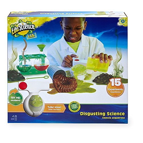 Studio : Toys R Us Publisher : Toys R Us Binding : Toy Product Description 15 Experiments!! Set uses common elements found in the kitchen. Includes: motorized toilet mixer, toxic waster can beaker, trash can mixer with lid, 3 gross molds, 3pc test tube stand, 2 bubbles test tubes, worm shaped stirrer, bubble wand, and funnel. Ages 8 years. Make "Snot Slime", "Yucky Worms", "Stink Bubbles", "Foaming Flush", "Electric Sludge"!!!! 0