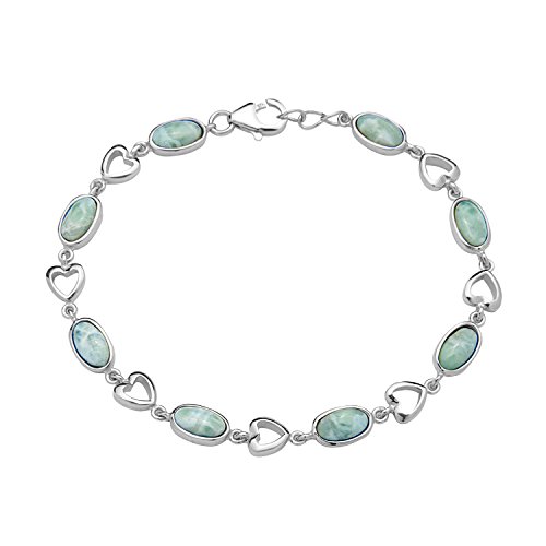 This bracelet is set with Larimar stones for a unique look. The sterling silver bracelet has a high polish finish, and secures with a lobster claw clasp