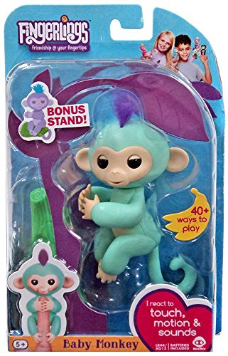 Zoe is my name and I love life upside down! Zoe is a turquoise monkey with soft purple hair who loves holding onto your finger and knows when she is being pet, talked to, and even hung upside down! Fingerlings are adorable baby monkeys that are curious about the world around them-starting with you! These interactive pets love to hang onto your finger, blink their eyes, turn their heads, blow kisses, swing by their tails, and talk in monkey babble! They come in a variety of colours including white, black, pink, purple, blue and turquoise. Adopt them all and have even more fun monkeying around!and turquoise. Clap your hands twice and your Fingerlings will sing together - Collect them all!Feature