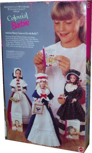 - Includes : Colonial Barbie Doll with Colonial Style Dress with Red Bows and White Collar, Bonnet, Choker, Shoes, Embroidery Square, Hairbrush, Doll Stand and "The Messenger Quilt" Mini Book