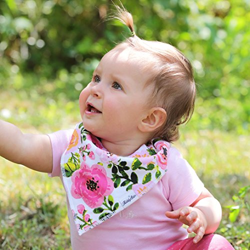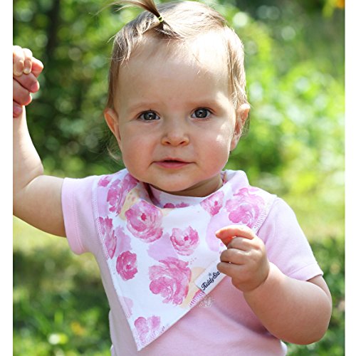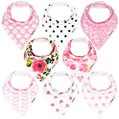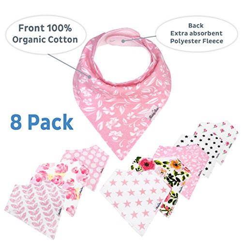 - Chic designs to ensure your baby looks cool from her childhood itself - set of 8 unique patterns with cute girlish designs - Dual layers effectively absorb moisture and prevent your baby from getting wet - contact of moisture for extended hours could result in skin issues or other health issues - Design that doesn't cover the clothes completely but simply enhances the look of them while also protecting effectively - Feeding times could be a serious mess - this single bib can provide protection against drooling, dribbling, spit-ups and even during feeding - Lightweight, Soft and Comfortable - Size that remains appropriate even as the baby grows from 0-24 months of age - simply adjust with the help of snap closures for a perfect fit - Way easier to clean than the regular dresses or clothes of a baby