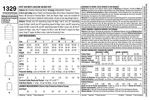 -. Binding : Misc. -. Brand : Simplicity Creative Inc. Patterns -. EAN : 0039363513292 -. Feature : Made in the United States / Instructions are written in English and Spanish / Simplicity sewing pattern / Available Sizes: A (S - L/S - XL) -. Label : Simplicity Creative Patterns -. Manufacturer : Simplicity Creative Patterns -. Model : 1329 -. MPN : US1329A -. NumberOfItems : 1 -. PackageQuantity : 1 -. PartNumber : US1329A -. ProductGroup : Art and Craft Supply -. ProductTypeName : HOME -. Publisher : Simplicity Creative Patterns -. Size : A (S - L / S - XL) -. Studio : Simplicity Creative Patterns -. Title : Simplicity Creative Patterns 1329 Boys' and Men's Vests Sewing Patterns, Size A (S-L/S-XL) -. UPC : 039363513292