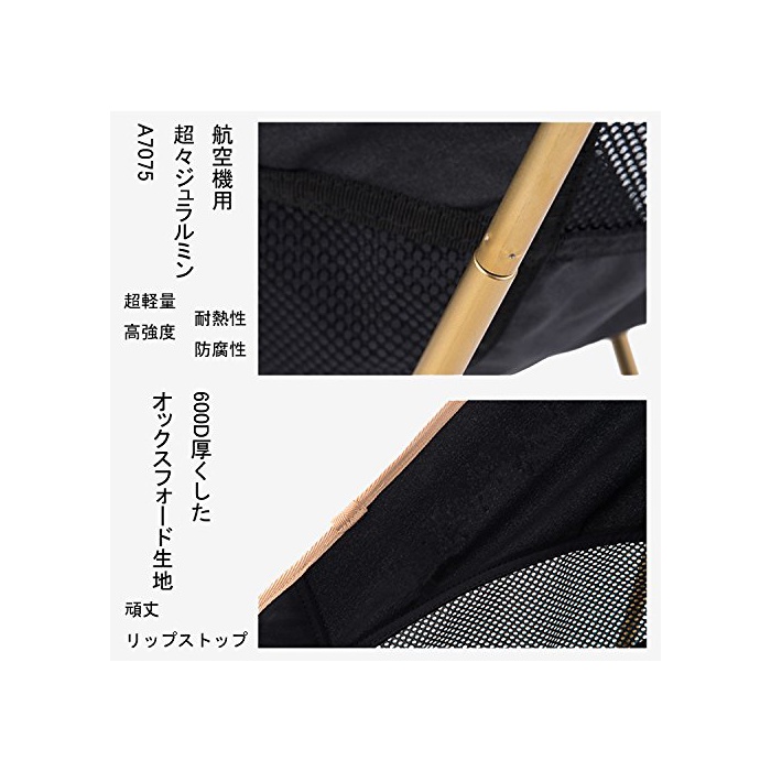 【고내구성】캠프 의자의 씨트 부분은 600D 두껍게 한 옥스포드 원단을 사용하고, 배면과 양쪽 겨드랑이로는 메쉬 사양으로 환기성도 발군입니다.뼈대의 파이프는 경량 또한 고강도의 항공기 그레이드의 A7075알루미늄 합금 소재에,내열성과 방부성으로도 뛰어나 있습니다.