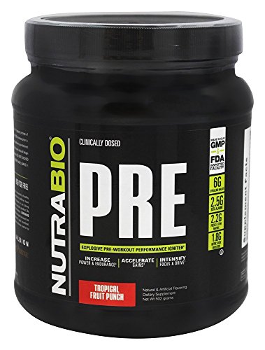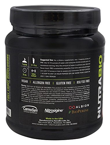 -. Feature : NUTRABIO PRE was formulated with a single goal in mind: to create the absolutely most effective, thorough, and purest pre-workout in existence...period. We can say without a doubt that this goal has been accomplished, making PRE one of the most powerful pre-workouts on the market today. / PRE is built upon clinically dosed and scientifically backed ingredients that have been sested to maximize workout performance and produce results. / SYNERGISTIC COMBINATION of ingredients found in PRE will help prepare your body physiologically and psychologically by amplifying energy, enhancing the mind-muscle connection, and supporting increases in muscular strength, power, and endurance. From top to bottom, PRE will help keep you training, stronger and longer.