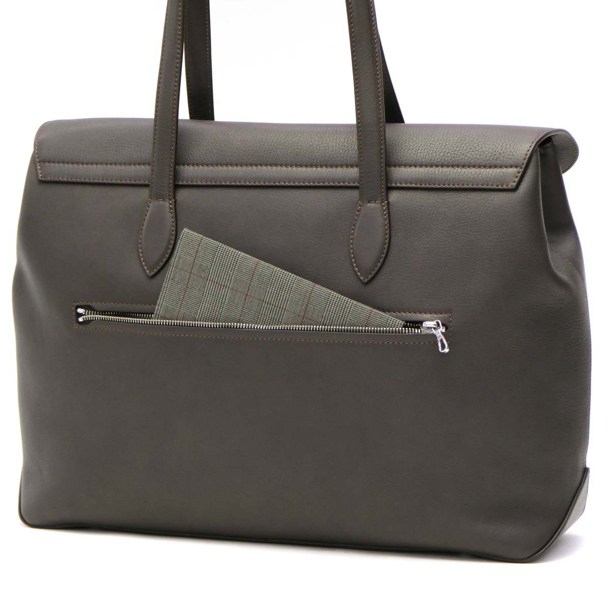 A convenient back pocket that can be used without opening the bag is convenient for storage of frequently used baggage such as smartphone and pass case. In addition, leather flaps are also attached to prevent clothes from getting in and out easily.