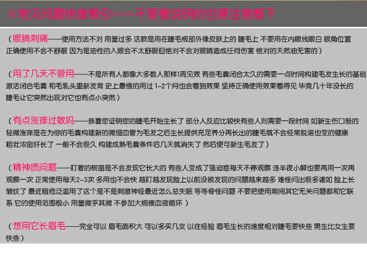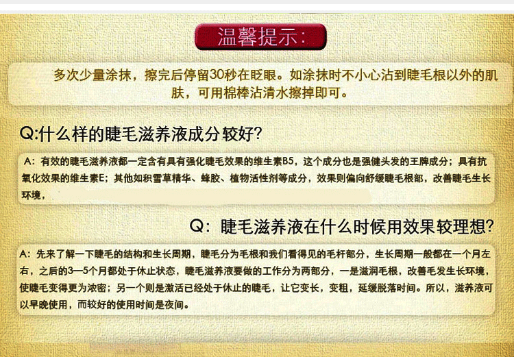 不是睫毛膏,是生长液!! 因为生长液是胶原蛋白晶体,请亲们使用的时候先在瓶子里多搅动几下;天然成分,温和滋润,从根源解决睫毛自然再生的问题,活化根部细胞,唤醒睫毛,为睫毛补充营养,使睫毛浓密有光泽,延长成长期保持其浓密美丽,防止睫毛断裂脱落。如果作为睫毛膏底液使用,可使睫毛更加浓密,养护美丽睫毛!