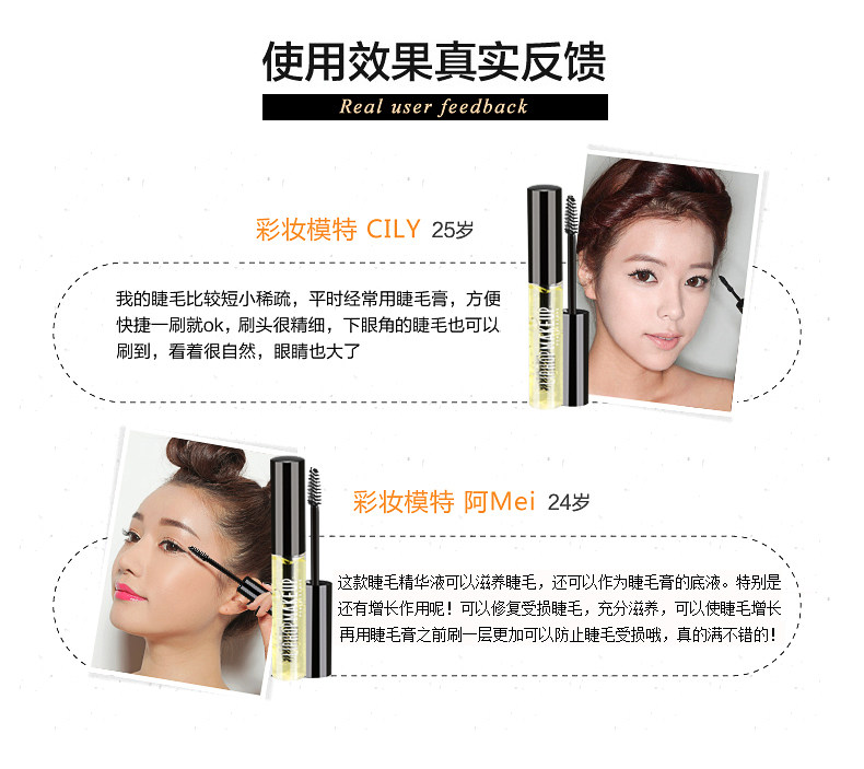 使用方法:卸妆清洁睫毛后,使刷头沿着睫毛的弧度,托起睫毛,只需涂抹于睫毛前端1/3处即可!