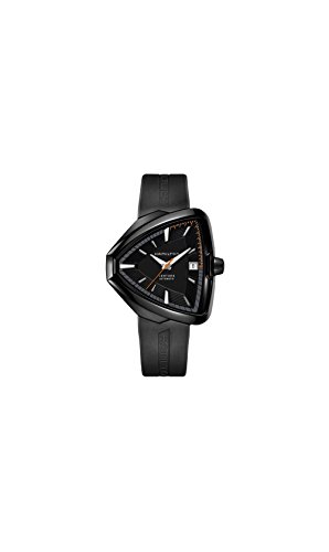 Studio : Hamilton Publisher : Hamilton Binding : Watch Product Description Black PVD stainless steel case with a black rubber strap. Fixed black PVD bezel. Black dial with silver-tone hands and index hour markers. Dial Type: Analog. Luminescent hands and markers. Date display at the 3 o'clock position. Automatic movement. Caliber h-10 engine with about 80 hours power reserve. Scratch resistant sapphire crystal. Pull / push crown. Skeleton case back. Case diameter: 42.5 mm x 44.6 mm. Case thickness: 10 mm. Unique case shape. Tang clasp. Water resistant at 50 meters / 165 feet. Functions: date, hour, minute, second. Luxury watch style. Watch label: Swiss Made. Hamilton Ventura Elvis80 Automatic Black Dial Black PVD Mens Watch H24585331. 0