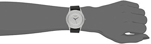 -. Feature : Silver crystal pave dial with raised border and classic three hand movement / Blued steel alpha style hour and minute hands / Polished and beaded silver tone alloy case with diamond bezel and black satin strap / Quartz movement with analog display / Water-resistant to 30 M (100 feet)