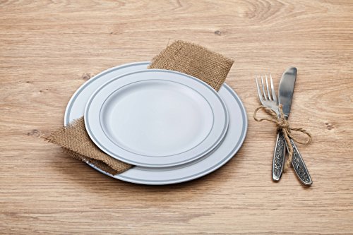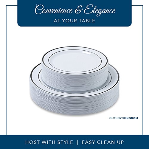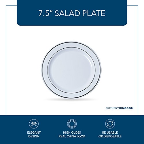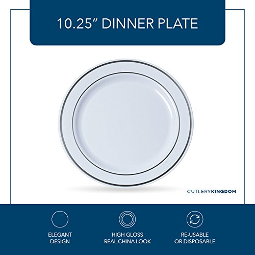 Disposable Plastic Plates - 60 Pack - 10.25" Dinner and 7.5" Salad Combo - Silver Trim Real China Design - Premium Heavy Duty - by Cutlery Kingdom