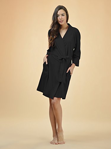 SIORO Cotton Robes Lightweight Kimono Robe Gowns Soft Knit Bathrobe Nightwear V-Neck Loungewear Sexy Sleepwear Short for Women, Black, M