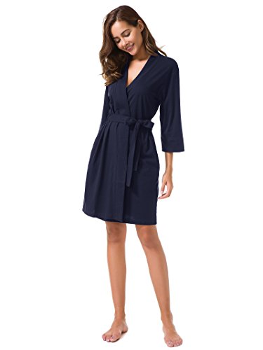 SIORO Cotton Robes Lightweight Kimono Robe Gowns Soft Knit Bathrobe Nightwear V-Neck Loungewear Sexy Sleepwear Short for Women Navy M