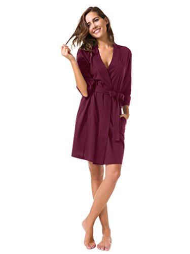 SIORO Cotton Robes Lightweight Kimono Robe Gowns Soft Knit Bathrobe Nightwear V-Neck Loungewear Sexy Sleepwear Short for Women Burgundy L