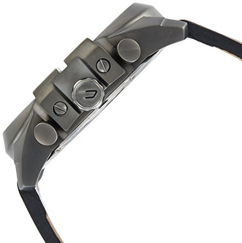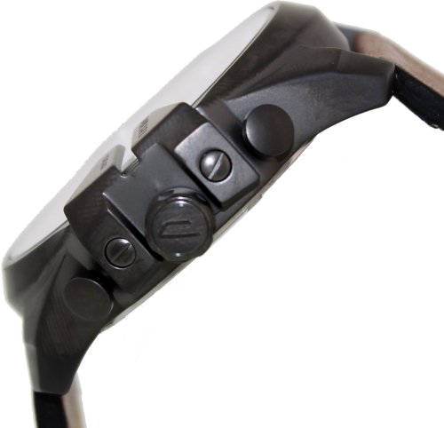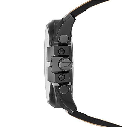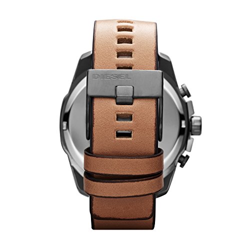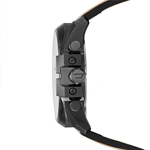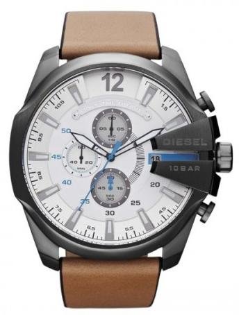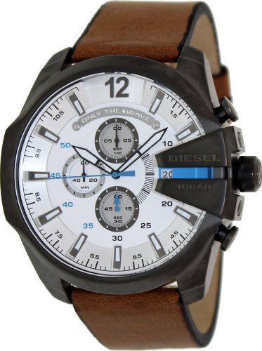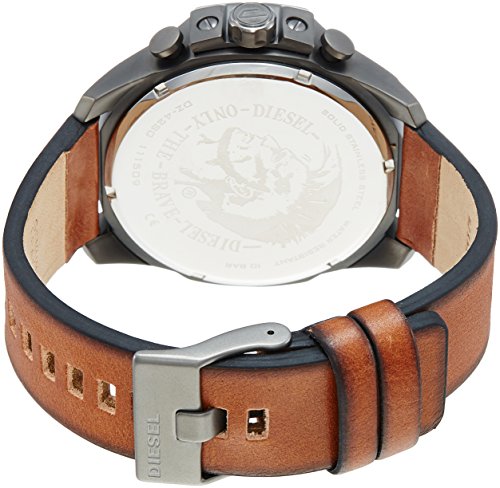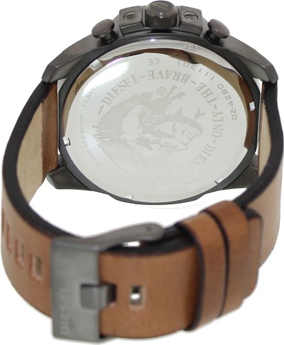 Studio : Diesel Publisher : Diesel Binding : Watch Product Description Gunmetal ion-plated stainless steel case with a tan leather strap. Fixed gunmetal ion-plated bezel. White dial with luminous hands and stick hour markers. Arabic numeral marks the 12 o'clock position. Minute markers around the outer rim. Dial Type: Analog. Luminescent hands and markers. Date display at the 3 o'clock position. Chronograph - three sub-dials displaying: 60 second, 60 minute and 1/10th of a second. Quartz movement. Scratch resistant mineral crystal. Solid case back. Case dimensions: 51 x 59 mm. Case thickness: 12 mm. Round case shape. Band width: 26 mm. Tang clasp. Water resistant at 100 meters / 330 feet. Functions: chronograph, date, hour, minute, second. Casual watch style. Diesel Mega Chief Chronograph Gunmetal IP Stainless Steel Mens Watch DZ4280. 0