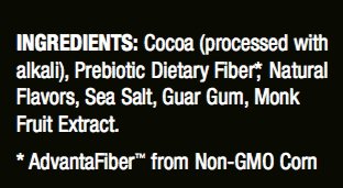 REAL FOOD INGREDIENTS: Bensdorp Royal Dutch Cocoa, Prebiotic Dietary Fiber, Natural Flavors, Sea Salt, Guar Gum, Monk Fruit Extract. Produced In a Certified, Gluten-Free Facility.