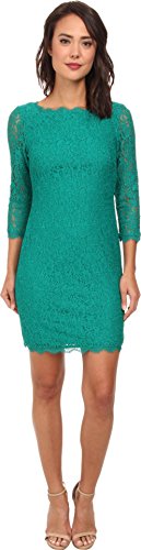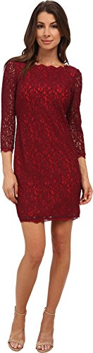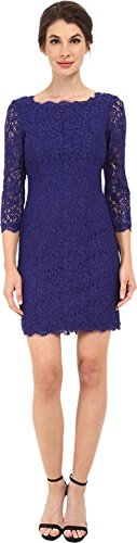 Lace dress featuring boat neckline and unlined three-quarter sleeves