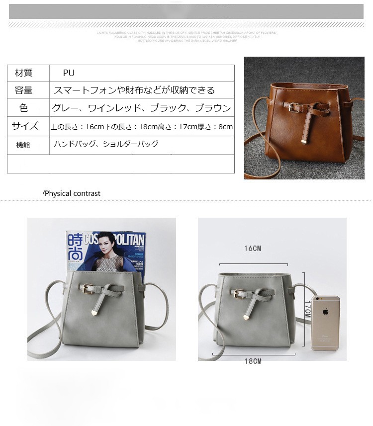 商品番号:WA006商品説明:◆伸縮性:有り◆厚さ:普通◆素材:PU、ポリエステル、金属◆バッグのサイズ:上の長さ:16cm約 下の長さ:18cm約 高さ:17cm約 厚さ:8cm約◆色:ワインレッド、ライトブルー、ブラック、ブラウン◆重量:350g約◆商品内容:1xバッグ特徴:【軽くて、携帯便利】小さいサイズなので、軽くて、携帯便利です。出かける時に最適!!コンパクトサイズのショルダーバッグ。内ポケット付きです。【欧米風】ファッションなバッグなので、学生にも人気があります。使い勝手が良いサイズなので、毎日の通勤通学にピッタリ☆【多彩な色】四種類な色を選択可能です。簡単的にファッションなデザインのカバンです。おすすめです。