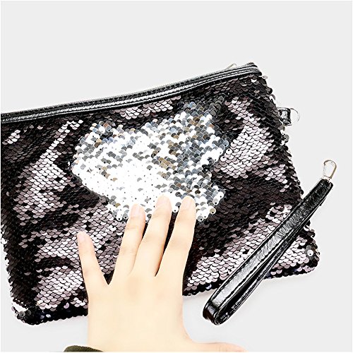 Product Description? Color : Black, Silver ? Size : 7" X 9.5" ? Strap Size : 7" L ? No Inside Pocket ? Zipper Closure ? Reversible Sequin Clutch Bag0