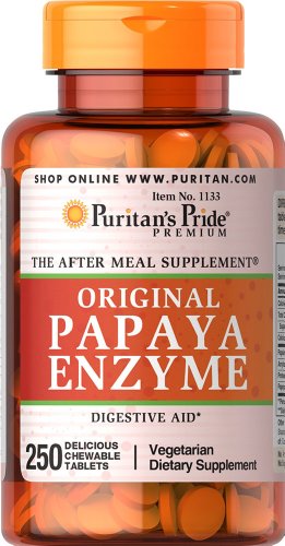 THE AFTER MEAL SUPPLEMENT Each pleasantly small, delicious, chewable fruit flavored Papaya tablet contains the enzyme papain. Starch- and preservative-free! ** These statements have not been evaluated by the Food and Drug Administration. These products are not intended to diagnose, treat, cure or prevent any disease. 0 |