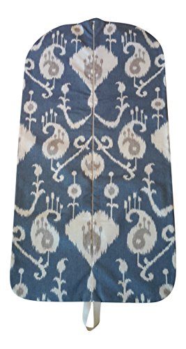 -. Brand : Carry It Well -. Color : Blue -. Department : womens -. Feature : Hanging garment bag, perfect for traveling in style / Width: 22 inches, Length 43 inches / 100% Cotton Fabric, Grosgrain Ribbon. Handmade in USA / Comfortably holds 3-5 garments, zips up the front with a grosgrain loop at bottom / Cold water wash and hang to dry. Great for travel or storage. -. Model : Blue and Tan Ikat Medallion -. PackageQuantity : 1 -. ProductGroup : Apparel -. ProductTypeName : LUGGAGE -. Size : 22"x43" -. Title : Carry It Well Women's Indigo Blue and Tan Medallion Ikat Hanging Garment Bag