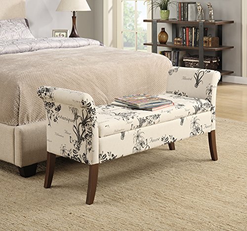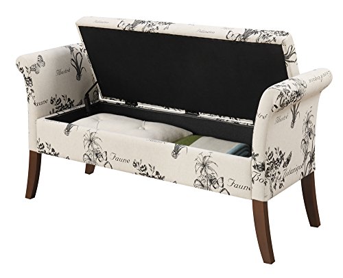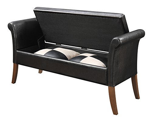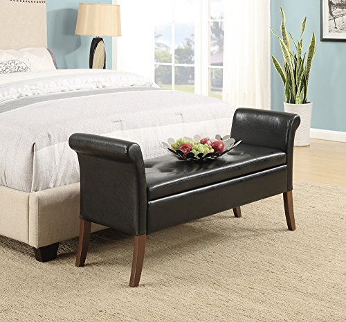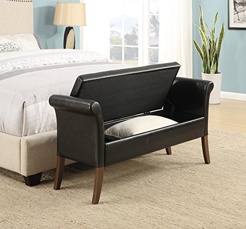 -. Feature : Constructed of faux leather, foam, and solid wood / Available in your choice of colored upholstery / Curved armrests and legs / Hinged lid top reveals hidden storage / Dimensions: 51.57L x 16.93W x 25.2H inches