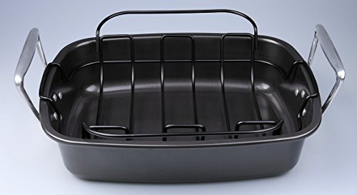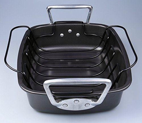- Feature : Sturdy heavy-duty steel construction / Wide cast aluminum triple-riveted and contoured handles for secure grip and easy handling / Deep 4-inch pan helps prevent spills and splatters / Unique suspension rack with integral helper handles for stable handling of roast / Non-stick for easy clean up