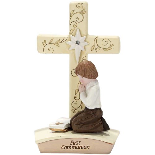 Boy Praying First Communion 5.5 x 5 Resin Stone Table Top Cross