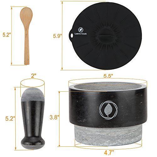 Laevo Cook Mortar and Pestle Set – REVERSIBLE – Large Granite Stone Set with FREE Silicone Lid / Mat and Spoon [5.5 Inch, 20 Oz]