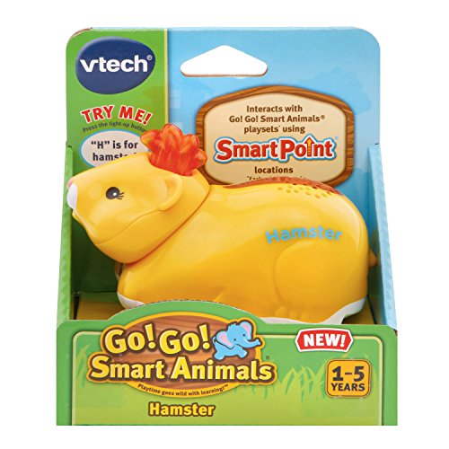 Holly is a huggable Go! Go! Smart Animals Hamster by VTech. Place the cute toy hamster on Smart Point locations, and she will respond with different phrases and more on Go! Go! Smart Animals and Go! Go! Smart Wheels playsets (each sold separately). Press Holly's light-up button to hear three sing-along songs and learn the letter H and her animal name as you play. Push the hamster to hear fun sounds and six melodies. While a melody is playing, push her again to add fun sounds on top of the melody. Each Go! Go! Smart Animals character is unique. Collect them all to experience their friendly personalities (each sold separately)! Requires 2 AAA batteries (batteries included for demo purposes only; new batteries recommended for regular use). Intended for children ages 1 to 5 years.Feature