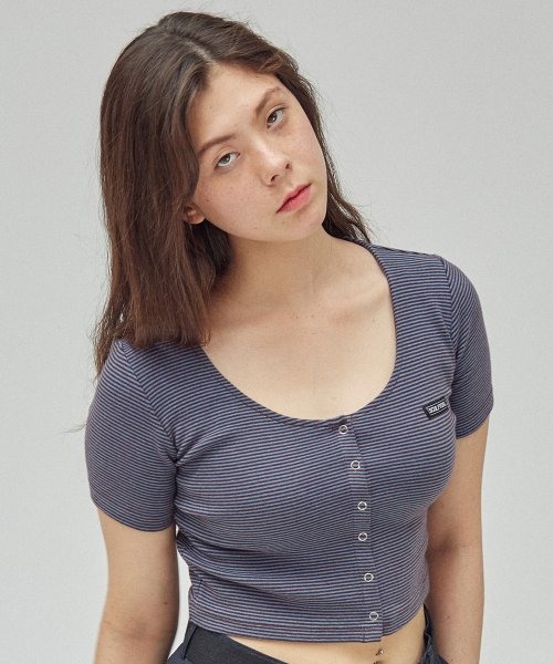 스컬프터(SCULPTOR) 버튼-다운 크롭 탑 [블루/브라운]