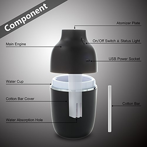 5.WHAT YOU GET :180ml Capacity Sealed humidifier, Adjustable two mist settings :continuously and intermittently up to 15 hours working time.