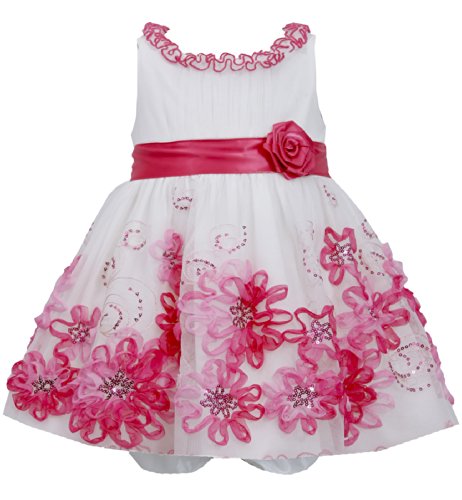 Sequin soutache mesh overlay dress with ruffle trim at necklineand satin rosette at waist