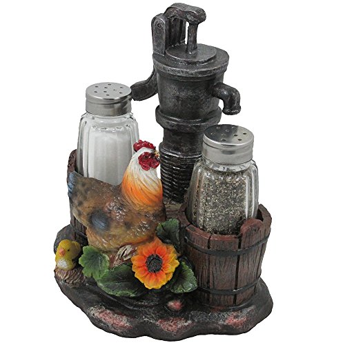 Product Description Add farmhouse freshness to your tabletop when this plucky chicken serves up your seasonings! Glass salt and pepper shakers nestle into their coordinating water buckets that are centered by a rustic water pump. Perfect decoration piece for anyone wanting to add a little country mealtime flair. 0