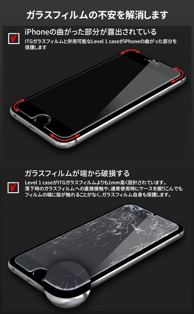 It is designed to be 1 mm higher than the ITG glass film and protects the glass film itself without direct contact with the film at the time of falling or touching the edges of the film even when gripping the case at normal times.