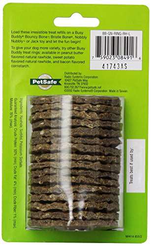 -. Binding : Misc. -. Brand : Premier -. Feature : All natural treats / Specifically made for the Bristle & Bouncy Bone / Refills contain 16 rings / Cornstarch based -. Label : Premier -. Manufacturer : Premier -. Model : BB GN RING RH M-PARENT -. MPN : BB GN RING RH M-PARENT -. NumberOfItems : 1 -. PackageQuantity : 1 -. PartNumber : BB GN RING RH M-PARENT -. ProductGroup : Pet Products -. ProductTypeName : PET_SUPPLIES -. Publisher : Premier -. Size : Large -. Studio : Premier -. Title : PetSafe Busy Buddy Refill Ring Dog Treats for select Busy Buddy Dog Toys, Natural Rawhide